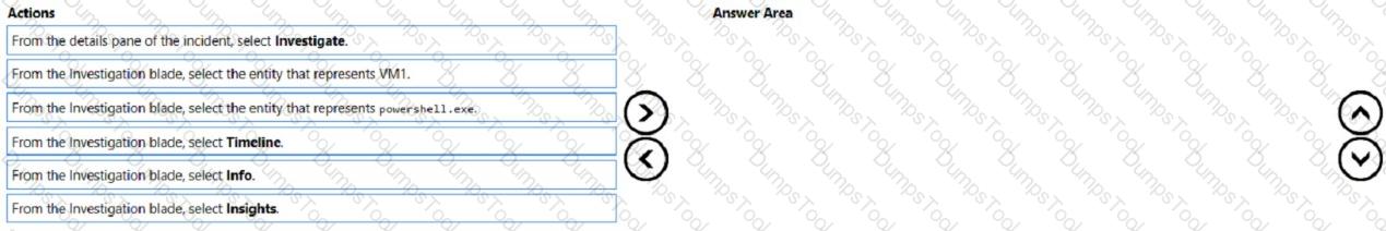 You need to investigate the incident, identify which event triggered the alert, and identify whether the following actions occurred on VM1 after the alert: