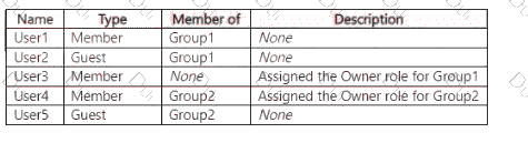 You have a Microsoft Entra tenant that contains two groups named Group! and Group2 and the users shown in the following table.