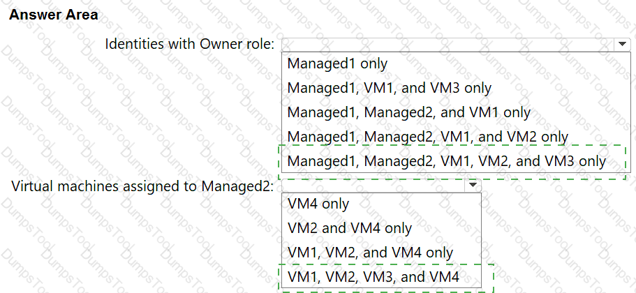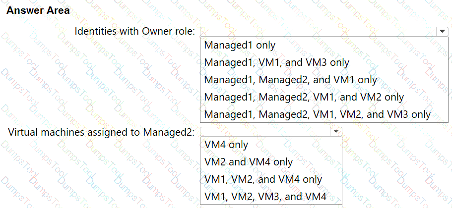 Which identities can be assigned the Owner role for RG1, and to which virtual machines can you assign Managed2? To answer, select the appropriate options in the answer area NOTE: Each correct selection is worth one point.