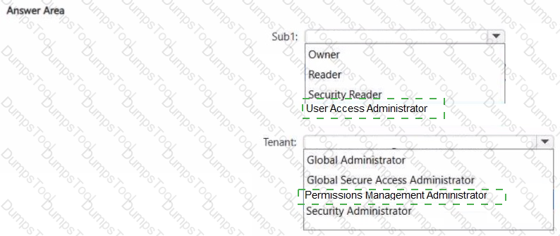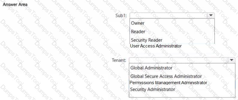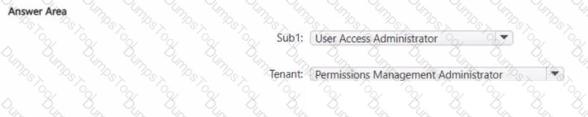 Which role should you assign for Sub1, and which role should you assign to User1 for the tenant? To answer, select the appropriate options in the answer area.