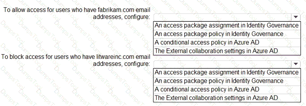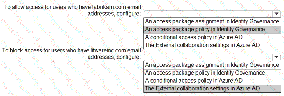 Fabrikam uses Azure AD and has two verified domain names of fabrikam.com and litwareinc.com. Both domain names are used for Fabrikam email addresses.