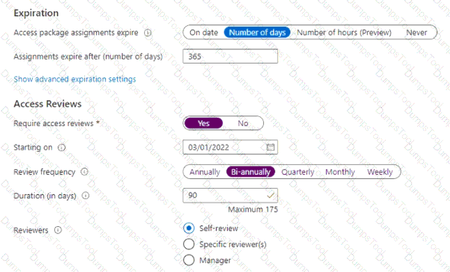 You have an Azure AD tenant that contains an access package named Package1 and a user named User1. Package1 is configured as shown in the following exhibit.