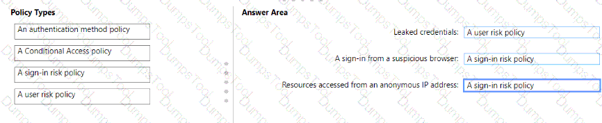 What should you configure for each incident? To answer, drag the appropriate policy types to the correct issues. Each policy type may be used once, more than once, or not at all. You may need to drag the split bar between panes or scroll to view content.