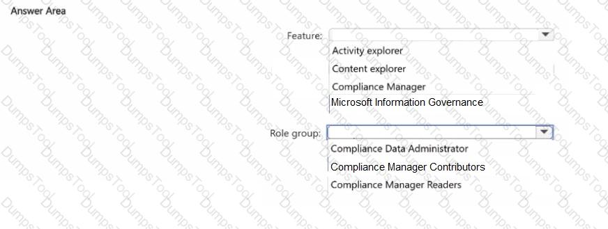 Which feature should you use and to which role group should you be added? To answer, select the appropriate options in the answer area.