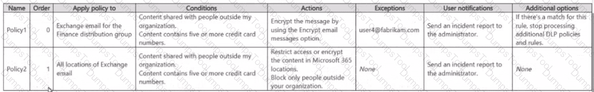 You have a Microsoft 365 E5 subscription that contains the data loss prevention (DLP) policies shown in the following table.