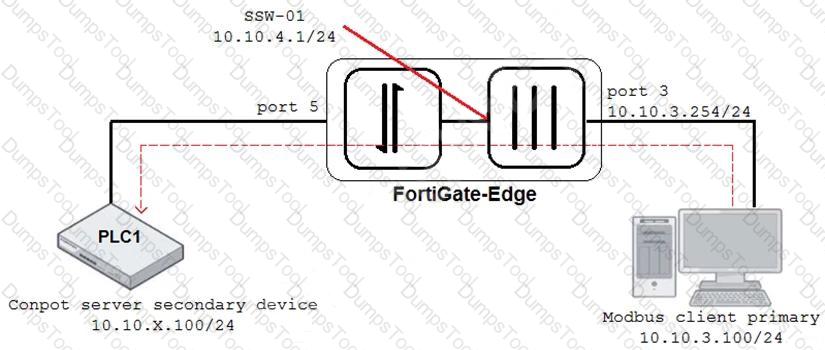 An OT architect has implemented a Modbus TCP with a simulation server Conpot to identify and control the Modus traffic in the OT network. The FortiGate-Edge device is configured with a software switch interface ssw-01.