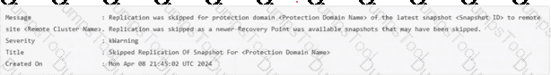 Replication was skipped for protection domain < Protection Domain Name > of the latest snapshot < Snapshot ID > to remote site < Remote Cluster Name > . Replication was skipped as a newer Recovery Point was available snapshots that may have been skipped.