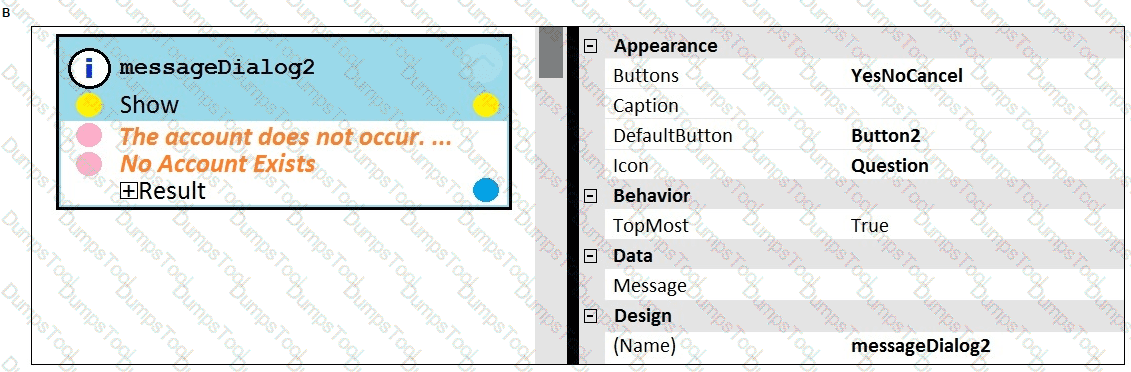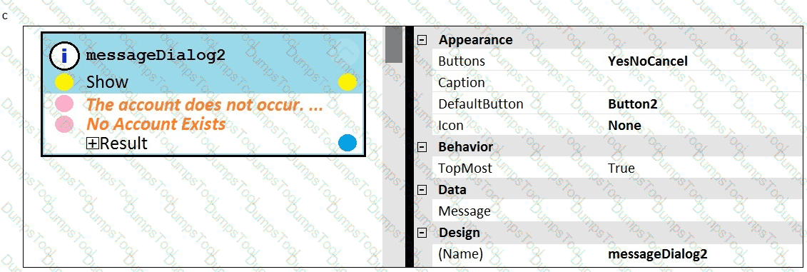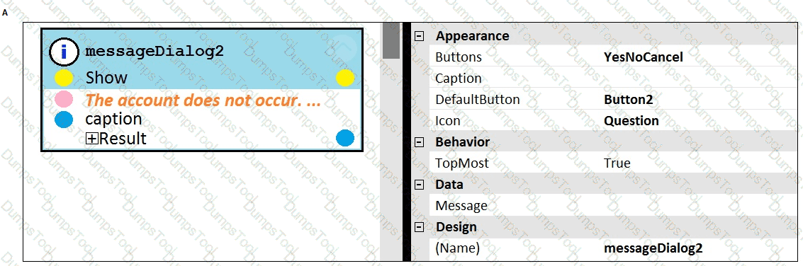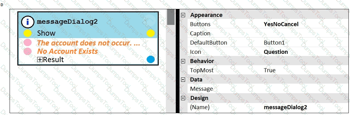 You add a MessageDialog component to an automation. Based on the following image, which option shows the configuration settings that generates the message dialog?