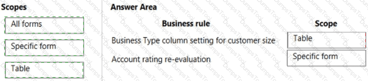 Which scope should you use? To answer, drag the appropriate scopes to the correct business rules. Each scope may be used once, more than once, or not at all. You may need to drag the split bar between panes or scroll to view content.