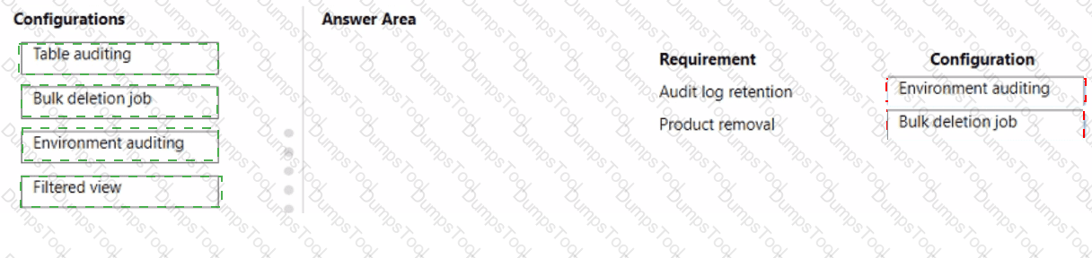 What should you configure? To answer, drag the appropriate configurations to the correct requirements. Each configuration may be used once, more than once, or not at all. You may need to drag the split bar between panes or scroll to view content.