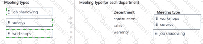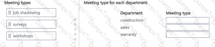 To answer, move the appropriate meeting types to the correct departments. You may use each meeting type once, more than once, or not at all. You may need to move the split bar between panes or scroll to view content.