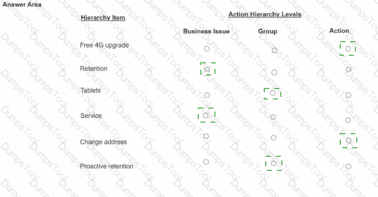 As a decisioning architect, you are setting up the action hierarchy for MyCo. Select the correct action hierarchy level for each of the hierarchy items identified.