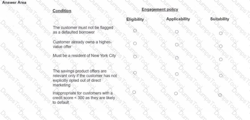 As a decisioning architect, how do you implement this requirement? In the Answer Area, select the correct engagement policy for each criterion.