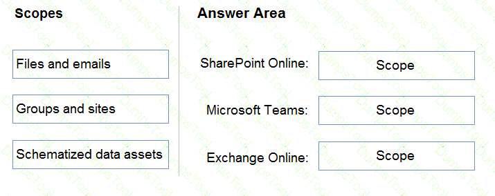 Which scope should you recommend for the sensitivity label policies? To answer, drag the appropriate scopes to the correct locations. Each scope may be used once, more than once, or not at all. You may need to drag the split bar between panes or scroll to view content.