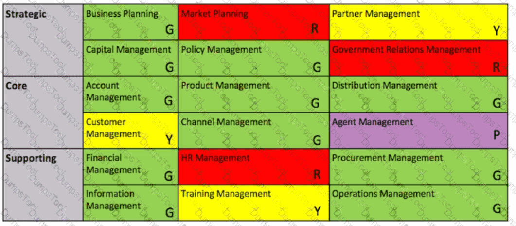 Consider the following business capability map. where cells of a model are given different colors to represent desired maturity levels (Green (G) = level achieved, yellow (Y) = one level away, red (R) =two or more levels away, purple (P) = missing capability):